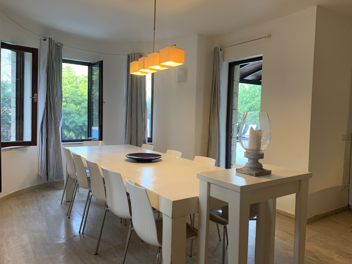 Salon: Pastel renk tonlarının hakim olduğu modern salonda konforlu oturma grubu, TV, uydu alıcısı, şömine, klime ve yemek masası yer almaktadır. Salondan havuz terasına geçiş vardır.